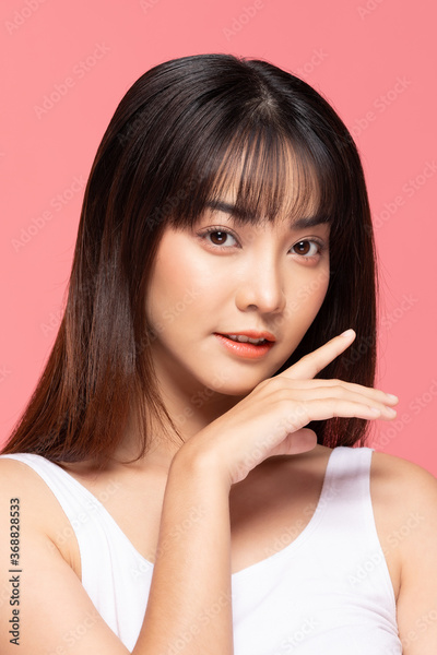 Beautiful Asian woman touching soft cheek smile with clean and fresh skin Happiness and cheerful with positive emotional,isolated on pink background,Beauty Cosmetics and spa Treatment Concept