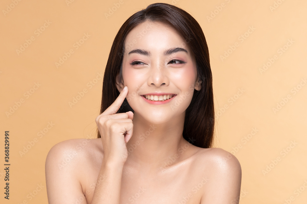 Beautiful Asian young woman touching soft cheek smile with clean fresh skin Happiness and cheerful with positive emotional,isolated on Beige background,Beauty Cosmetics and Facial treatment Concept