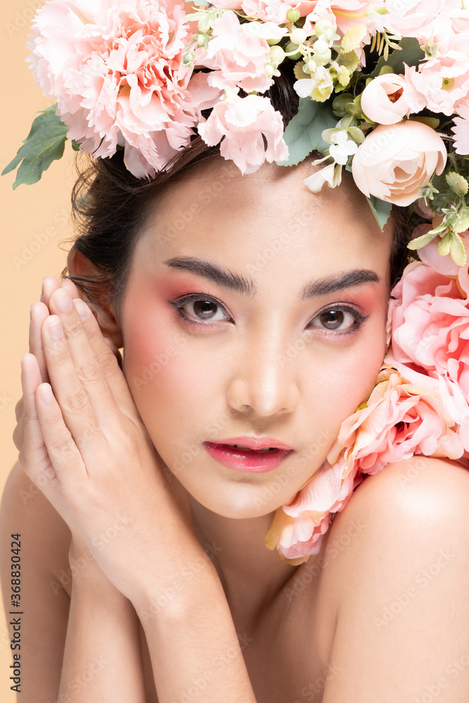 Beauty Asian young woman with big bouquet flowers on head smile