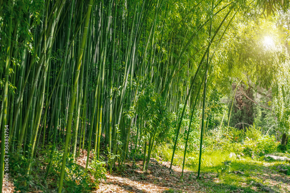 Bamboo forest and thickets with the bright light of the sun, green eco texture.