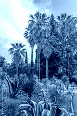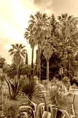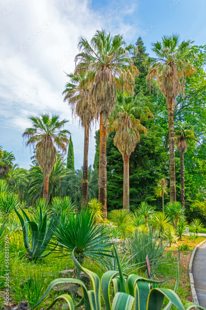 Thickets of different palms agave and other succulent plants in a tropical Mediterranean park.