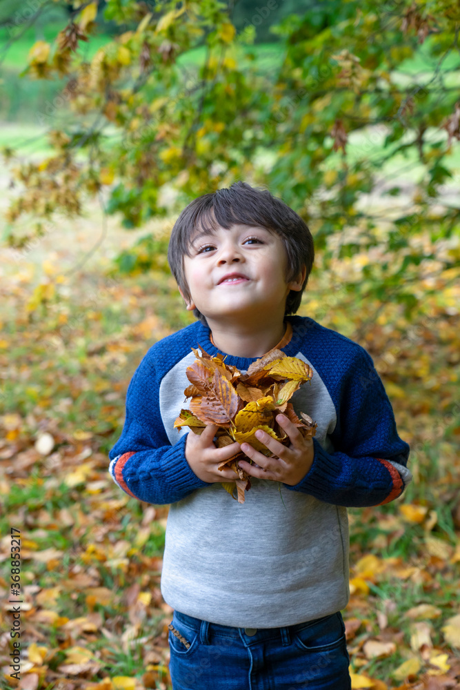 Portrait Active kid holding autumn leaves ready to throw in the air, Happy child playing under big tree, Cute little boy wearing jumper playing outside in Autumn park.