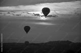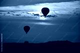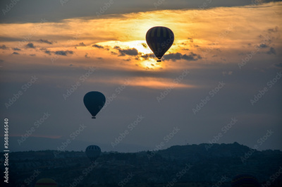 Colorful Hot air balloon flying over rocks and valley landscape at Cappadocia near Goreme Turkey