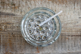 A glass ashtray with a lit cigarette stands on a wooden table.