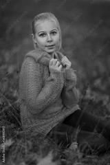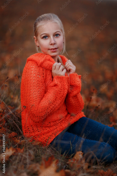 a girl with blond hair in an orange sweater sits in an autumn forest or park and looks at the camera