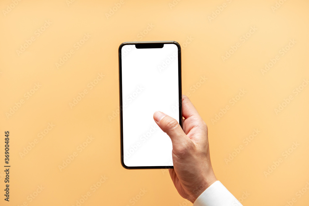 Smartphone mockup. Close up hand holding black phone white screen on yellow background. Mobile phone frameless design concept.