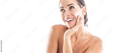 Beautiful young woman applying cream to her face isolated on white. Skincare spa wellness and cosmetics concept
