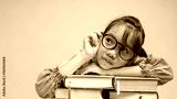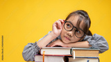 Thai Asian girl student fall down on stacked book, touching glasses and thinking in studio on orange or yellow background