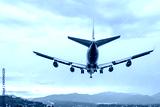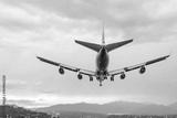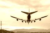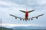 Landing of a large plane at the mountain airport, rear view of the runway end.