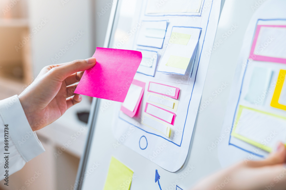 Mobile Application Designers are development on smartphone and pink paper note on hand, creative sketch planning.