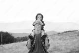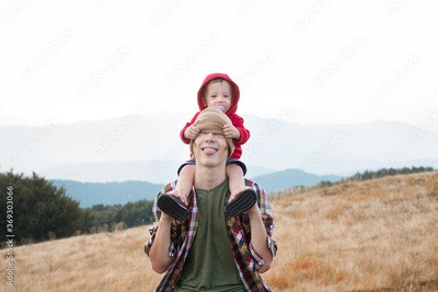 Brothers in autumn mountains. Childhood and brotherhood concept