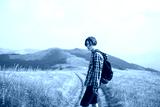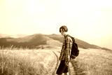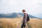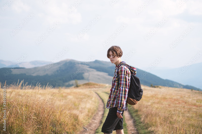 Boy with backpack on mountains road. Travel concept. Landscape photography