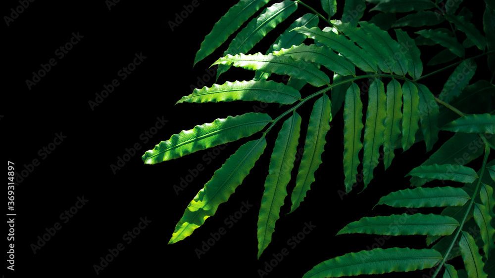 Green leaves fronds of giant fern or king fern (Angiopteris species) rare plant growing in wild, tropical rainforest plant on black background.