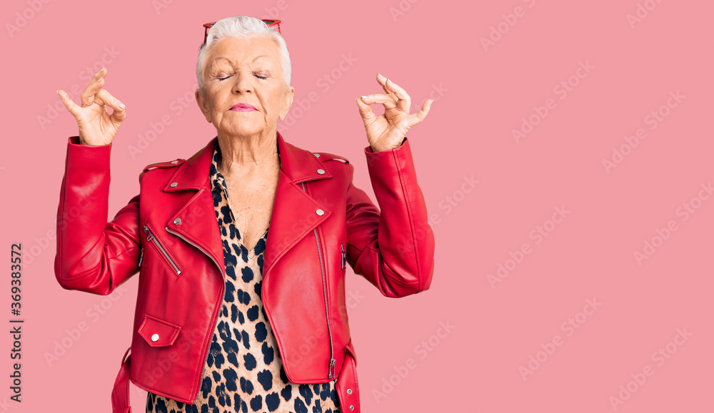 Senior beautiful woman with blue eyes and grey hair wearing a modern style with a red leather jacket relax and smiling with eyes closed doing meditation gesture with fingers. yoga concept.