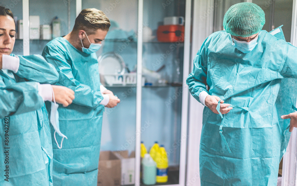 Doctors and nurse preparing to work in hospital for surgical operation during coronavirus pandemic outbreak - Medical workers getting dressed inside clinic - Focus on right man head