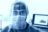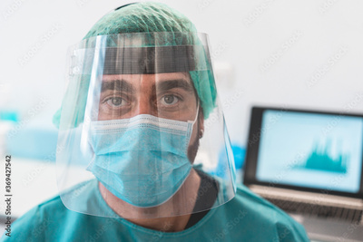 Portrait of man doctor at work inside hospital during coronavirus outbreak - Medical worker on Covid 19 pandemic wearing face protective mask - Focus on nose