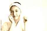 Pretty woman cleaning beautiful face by wiping, using cotton pads, cleansing lotion, facial toner. Attractive beautiful young lady has nice facial skin, bright facial skin. Facial skin care concept.