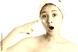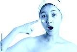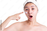 Beautiful asian woman apply face cream or sunscreen lotion to beautiful facial skin. Young female apply moisturizer on facial skin. Pretty girl has beauty facial skin. isolated on white background