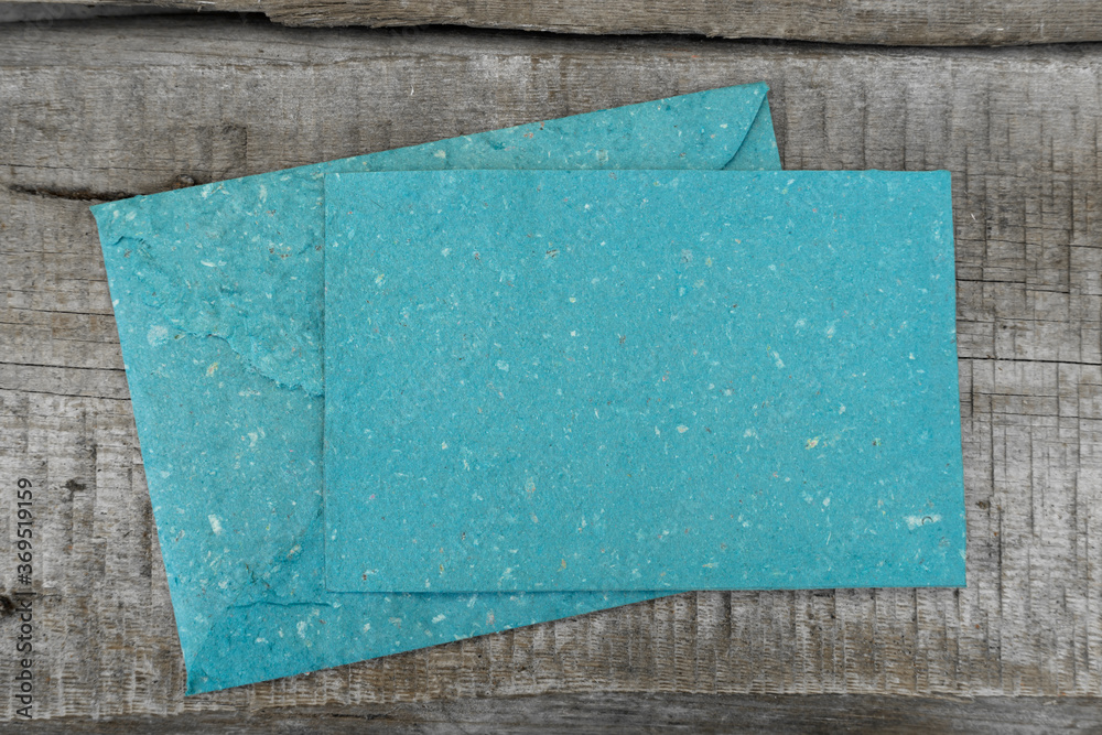 Handmade paper, sheet lies on a wooden table. Space for designer text, flat lay. The concept of recycling and creating beautiful handicrafts.