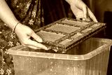 Woman holding frame for making paper sheets from waste paper pulp. Selective focus. Decorative and applied art. Recycling concept, ecology.