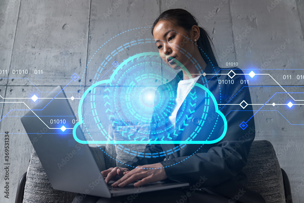 Businesswoman typing on laptop work in modern office on new project. Cloud tech drawing hologram. Double exposure. Concept of success.