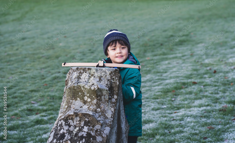Portrait of happy kid with smiling face standing behind old wall holding crossbow, Active child boy hiding behind stone brick shoot a toy crossbow, Outdoor activity during cold weather Winter