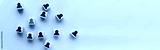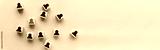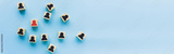 top view of wooden blocks with black and red human icons scattered on blue background, leadership concept, panoramic shot