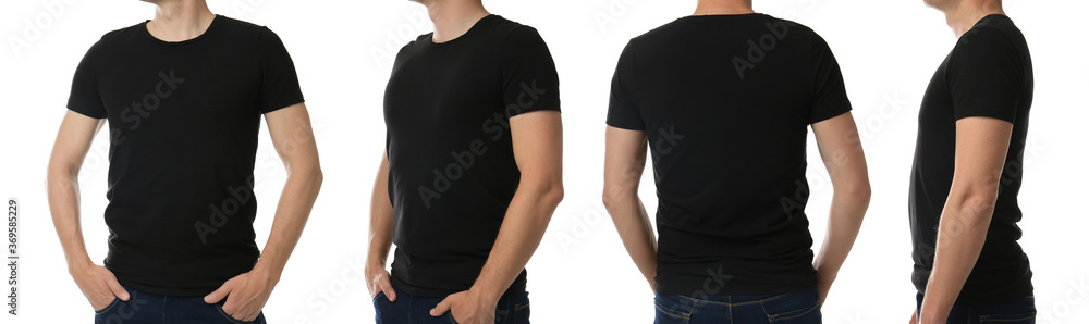 Collage with photos of man in black t-shirt on white background, closeup. Banner design
