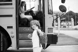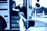 Back to school and happy time. Education: Smiling Elementary Student Ready To Board Bus.