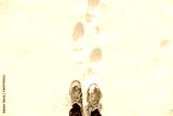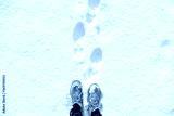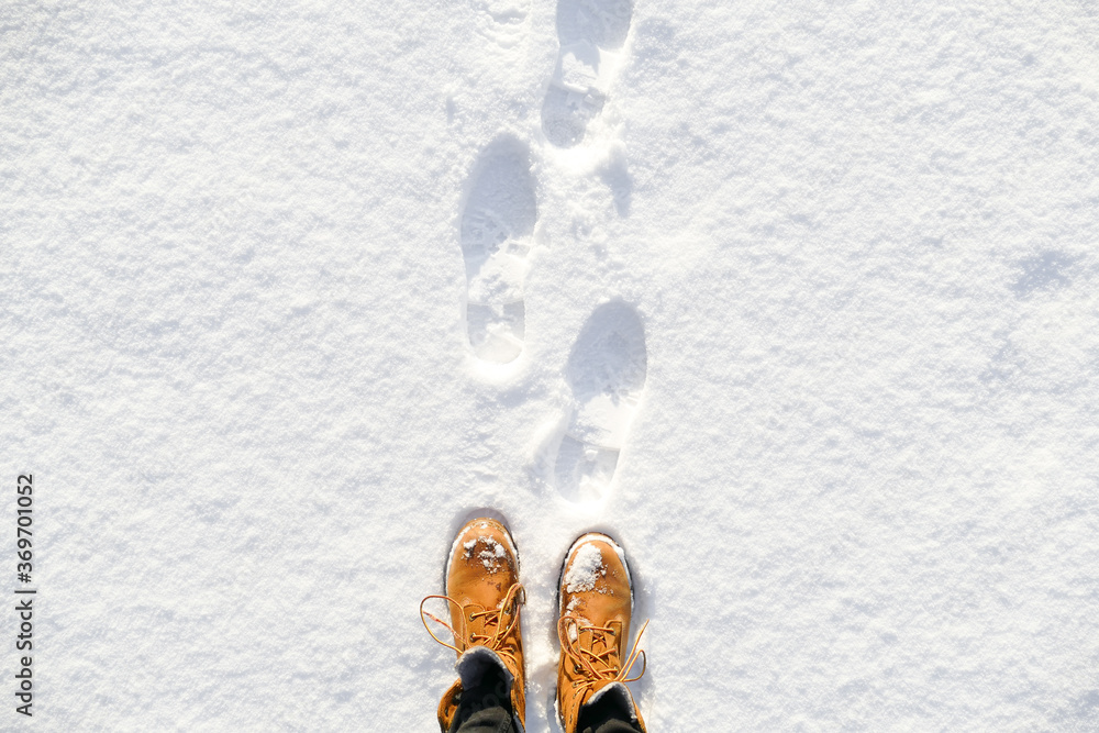 Top view of yellow shoes / boots footprint in fresh snow. Winter season.