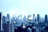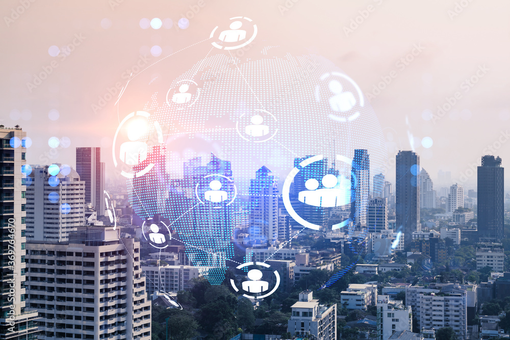 Social media icons hologram over panorama city view of Bangkok, Asia. The concept of people networking and connections. Double exposure.