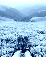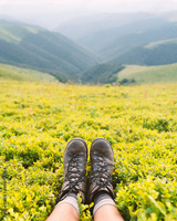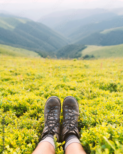 Boots of lonely tourist on lush blueberry bushs covered mountains hill. Landscape photography