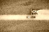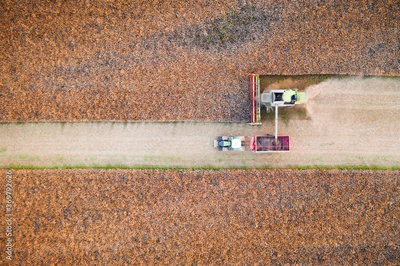 Harvesting oilseed rape in autumn field. A modern tractor stands directly next to the harvester combine and transports rapeseed. Aerial top view
