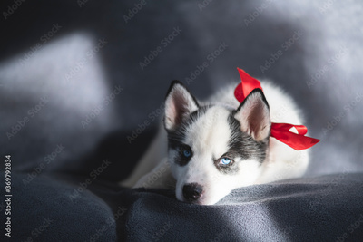 A small white dog puppy breed siberian husky with red bow sleep on grey carpet. Perfect birthday present for your child. Dogs and pet photography