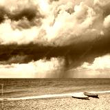 Two kayaks on sea edge. Dramatic storm clouds with rain on background. Summer time