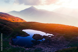 Mountain lake on sunrise time. Picturesque summer landscape with green mountain hills and sun rays in morning sky. Carpathian mountains