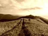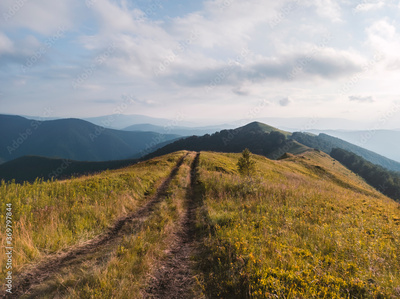 Amazing scene on autumn mountains. Orange grass and rural road in fantastic morning sunlight. Carpathians, Europe. Landscape photography