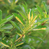 Close-up of Euonymus japonica bush with yellow and green leaves. Evergreen plant called Japanese spindle tree with blossoms
