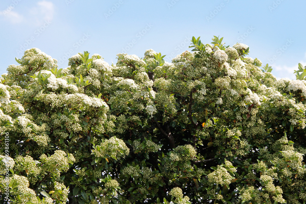 Pyracantha bush with white flowers against blue sky. Firethorn in bloom in summer