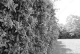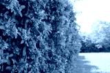 Pyracantha bush with white flowers and blossoms on a sunny day. Firethorn in bloom in summer