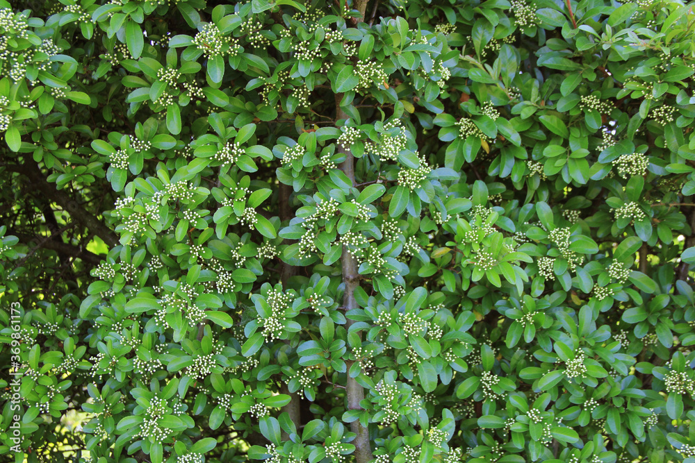 Pyracantha bush with white flowers and blossoms on a sunny day. Firethorn in bloom in summer