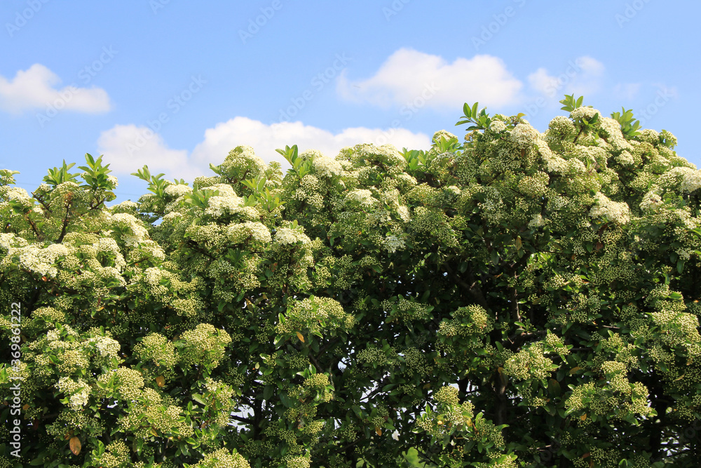 Pyracantha bush with white flowers against blue sky. Firethorn in bloom in summer