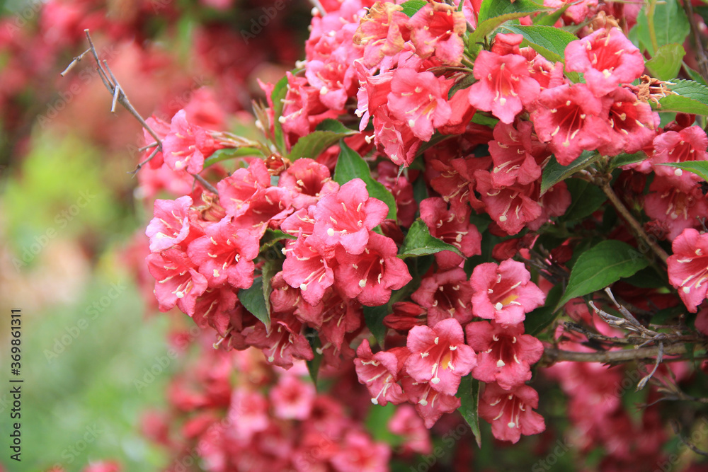 Close-up of Weigelia or Weigela bush in bloom on springtime. Weigelia pink flowers on branch