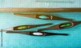 ํTop view of yarn in weaving shuttle tool on weaving machine. Textile fabric weave. Weaving using traditional weaving loom and shuttle.Textile or cloth production in Thailand. Green handmade cloth.