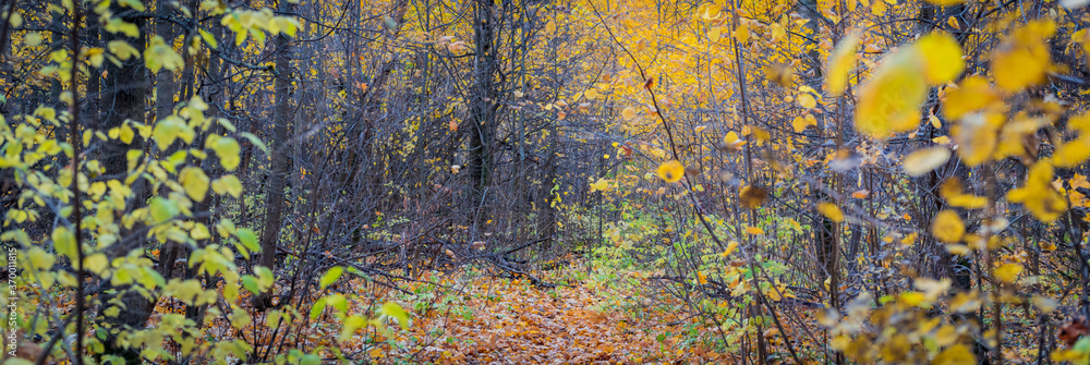 Panoramic forest autumn landscape with colorful leaves and trees