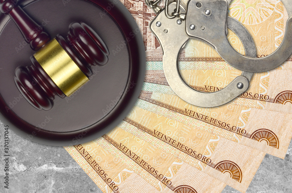 20 Dominican peso bills and judge hammer with police handcuffs on court desk. Concept of judicial trial or bribery. Tax avoidance