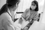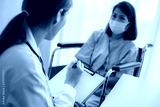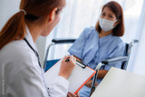 Beautiful young Asian female doctor is recording a medical history on the clipboard and explaining something to the female patient. Medical and health care concepts