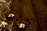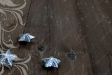 Shiny silvery Christmas stars toys on brown wooden boards. Suitable for a poster or greeting card.