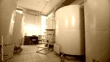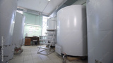 Large stainless steel alcoholic beverages distilling tanks. Silos for wine and cognac fermentation in distillery. On tanks written: number and volume of tanks