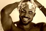 Close up smiling African American handsome young man washing cleaning hair with foamy anti-dandruff shampoo, taking shower, enjoying morning routine procedure, standing in bathroom